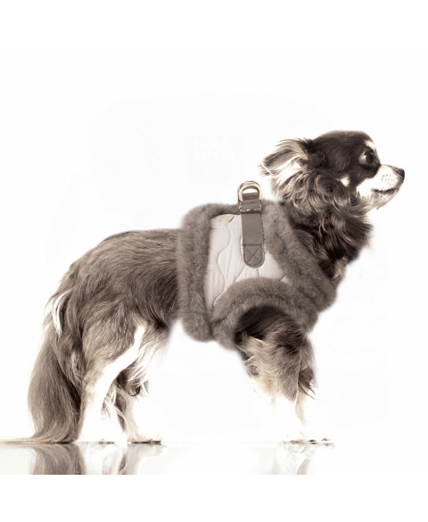 Het tuig is vervaardigd uit gewatteerd taupekleurig polyester met een waterafstotende behandeling. Hierdoor is het bestand tegen lichte regen en ideaal voor dagelijks gebruik, ongeacht het seizoen. De binnenvoering en afwerking zijn uitgevoerd in zachte taupe/bruin fantasiebont, wat zorgt voor extra warmte en een aangenaam draagcomfort voor je hond.
