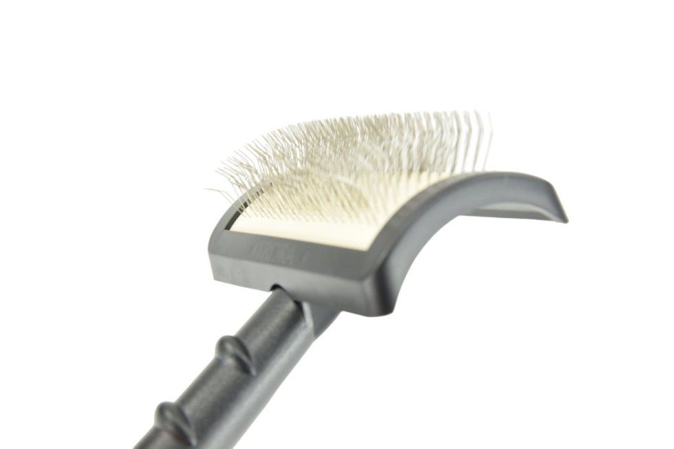 Deze professionele slicker borstel is uitgevoerd met een ergonomisch kunststof handvat, speciaal gevormd voor een comfortabele grip tijdens het borstelen. Het ontwerp zorgt voor een gebruikservaring die niet alleen effectief is, maar ook comfortabel voor je huisdier.